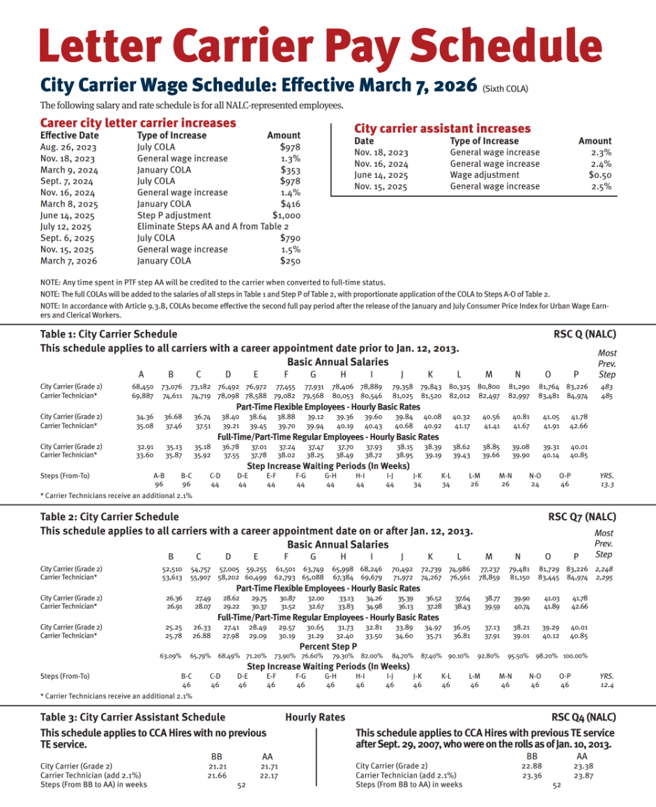 The city carrier wage schedule lists the salary and rate schedule for all NALC-represented employees.